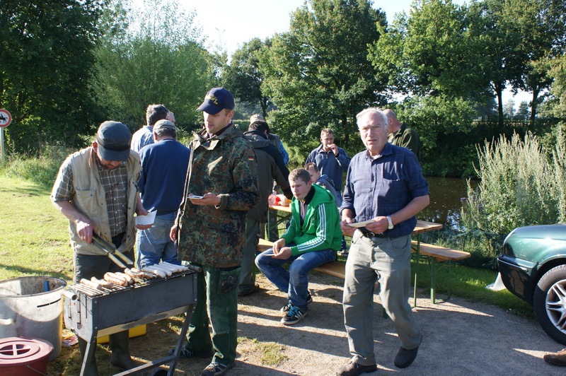 Das diesjährige Nacht- und Aalangeln fand an der Ems Höhe Herrlichkeit statt. 20 Vereinsmitglieder konnte der 1. Vorsitzende Klaus-Peter Kranke begrüßen. Geangelt wurde von 20.15 Uhr bis zum nächsten Morgen. Über Nacht blieb zwar der Regen aus, jedoch sank das Thermometer in den einstelligen Bereich. Bis auf zwei Teilnehmer, die es dann wohl doch vorzogen das heimische Bett aufzusuchen, ließen am Morgen alle Petrijünger ihren Fang wiegen. Das Frühstück in Form einer Wurst vom Grill (Theo sei dank) ließ vorübergehend die Müdigkeit schwinden. Nachdem alle gestärkt waren, konnte Klaus-Peter die Siegerehrung vornehmen. Mit großem Abstand gewann Werner Ketteler die Friedfischwertung. Mark Wisniewski und Martin Gösling folgten auf den Plätzen zwei und drei. Mit dem Fang einer Brasse von fast sieben Pfund sicherte sich Werner Ketteler auch den Wanderpokal für den schwersten Fisch. Die Aalwertung gewann Philip Gutzeit.