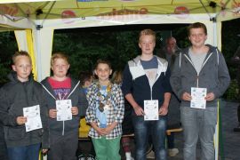 In diesem Jahr gab es die Ergebnisse erst eine Woche später, beim gemeinsamen Fest mit den Erwachsenen, im Vereinsheim. Bis dahin wusste keiner wer der neue Angelkönig werden könnte. Dann die Überraschung. Der neue Jugendkönig ist Moritz Boch. Der jüngste Jugendkönig ließ sich von fast 80 Gästen mit einem dreifachen Petri Heil beglückwünschen. Die nachfolgenden Plätze belegten Marvin Niemerg und Jan Beelenherm die genauso Stolz vor großem Publikum und mit viel Applaus, ihre Gutscheine in Empfang nahmen. Beim Stiefelweitwurf gab es noch zwei Sonderpreise abzuräumen. Mit dem gemeinsamen Grillen ging das Königsfest noch lange weiter.