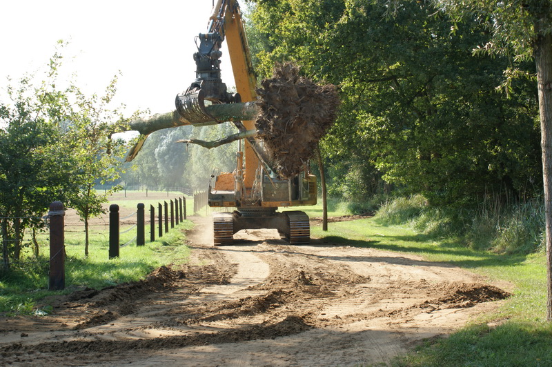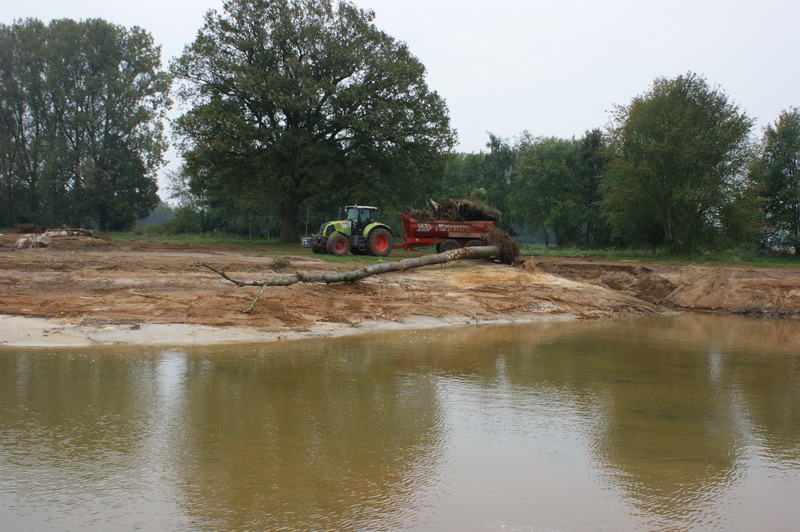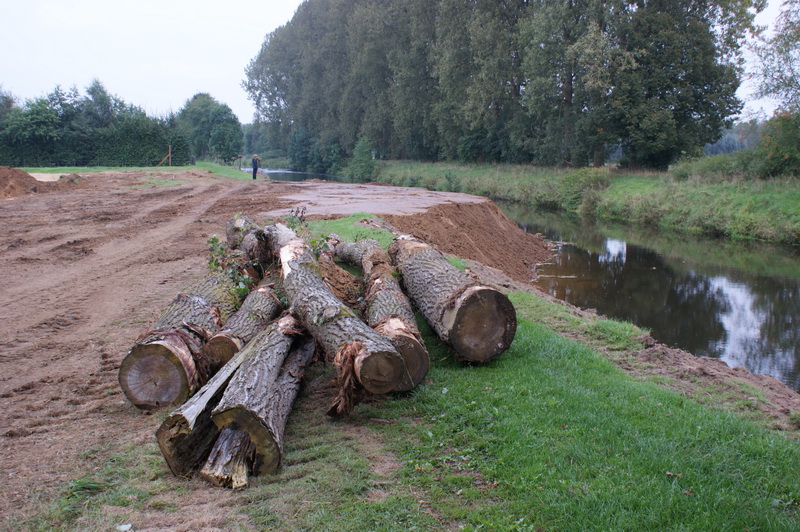 Einzelbäume aus dem Maßnahmengebiet mit Stammdurchmessern von bis zu ca. 1,0 m werden mit Baggern umgedrückt, die Wurzelstöcke freigelegt, der gesamte Baum mit Ästen bis zur Einbaustelle transportiert und im Bereich des neuen Emsverlaufes abgelagert. Jeder Baum wird zur Strömungslenkung mit einem Bagger ausgerichtet.