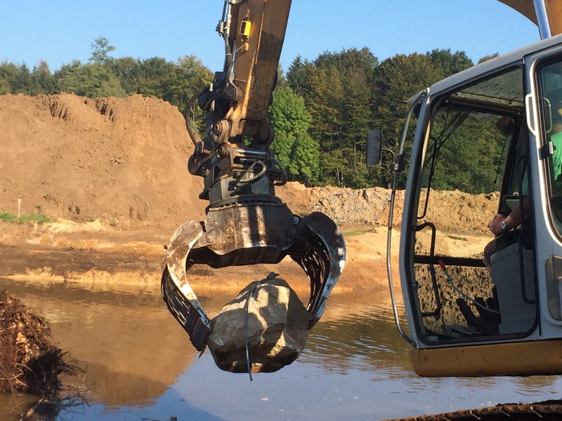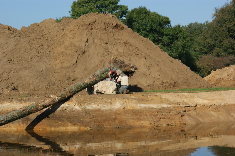 Zusätzlich werden diverse Wurzelstubben eingebracht. Sie erhöhen die Strukturvielfalt, erzeugen vielfältige Strömungen, sind Lebensraum und dienen teilweise zur Böschungssicherung
