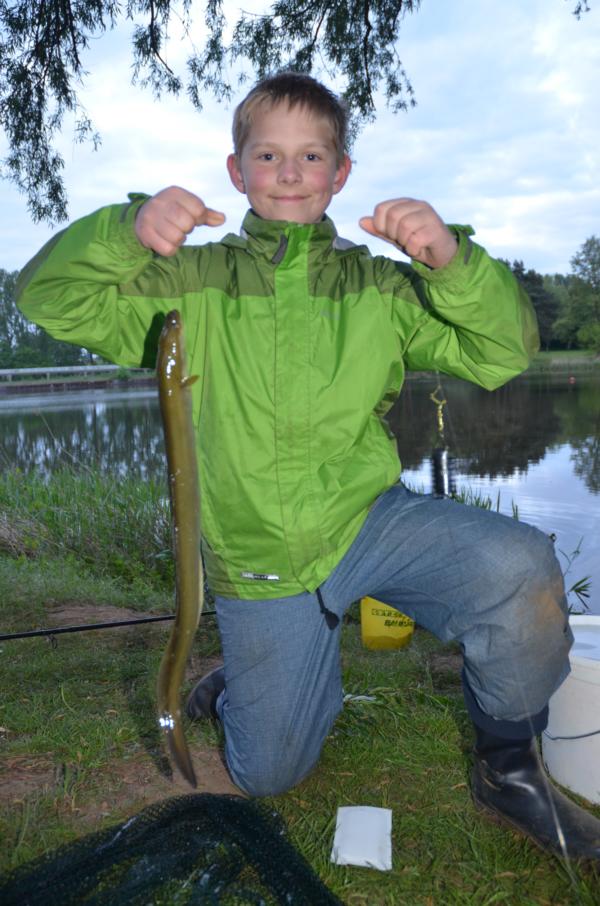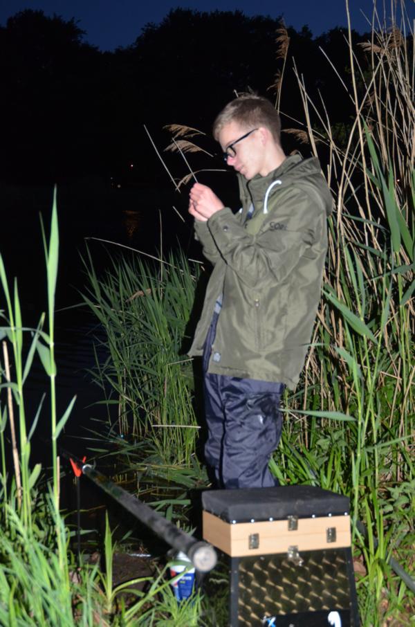 Das eigentliche Angeln begann um 19.45 Uhr. Pünktlich zum Start hörte dann auch endlich der Regen auf. Während die Einen schon die ersten Rotaugen fingen, bauten Andere noch an ihren Nachtlagern. Neben den Weißfischen, beim Stippen, wurden auch größere Fische beangelt. Für einige Jungangler war ein Karpfen das auserkorene Ziel. Am Besten Einer von den ganz Großen. Noch bevor es dunkel war, konnte tatsächlich ein kapitaler Karpfen zum Biss verleitet werden. Leider war er zu stark und ging verloren. Zu späterer Zeit gelang der Fang einer großen Brasse. Über 2kg brachte der „Klodeckel“ auf die Waage.