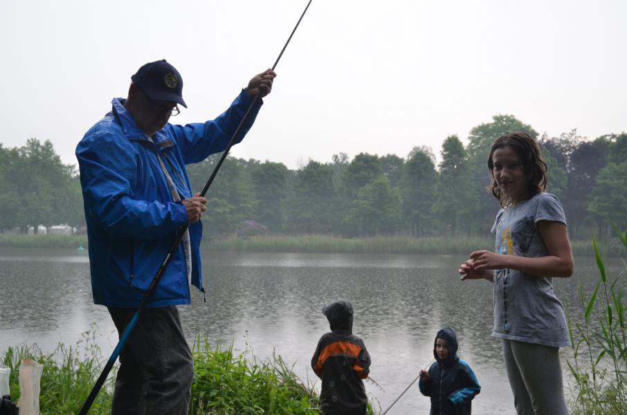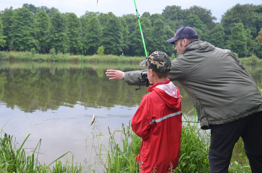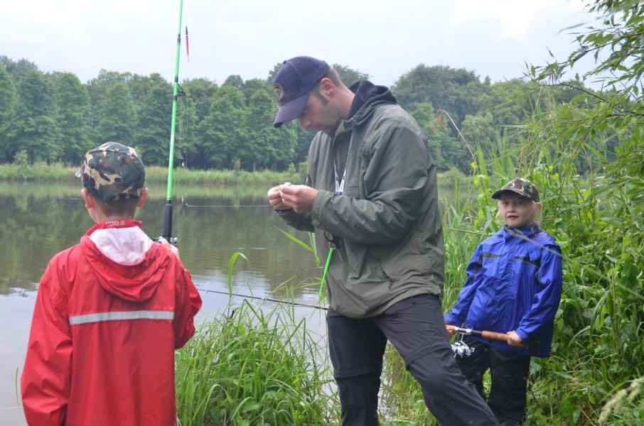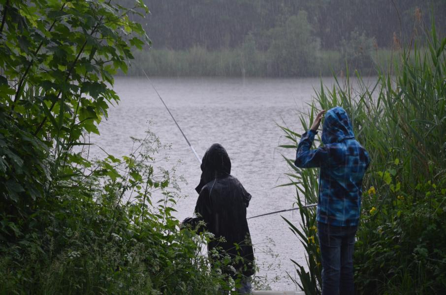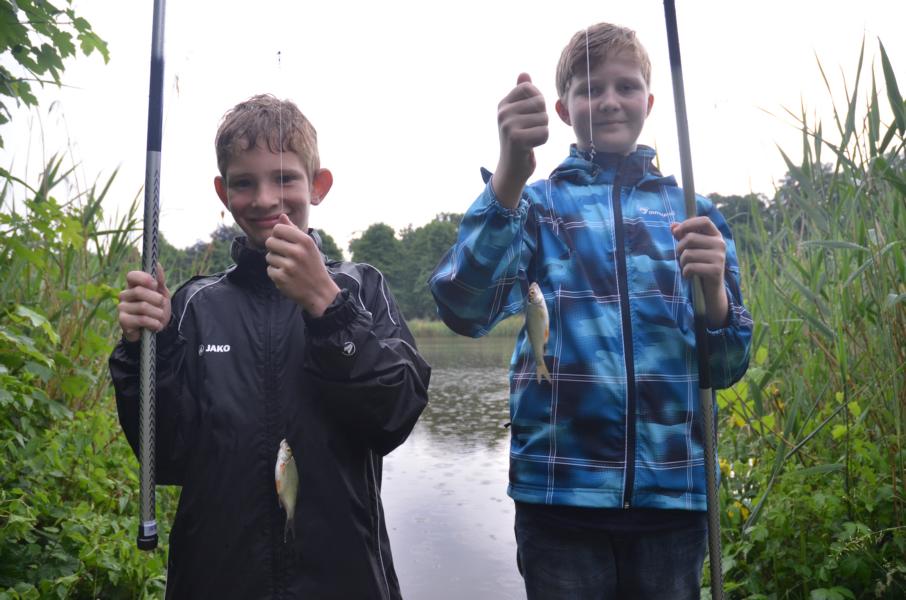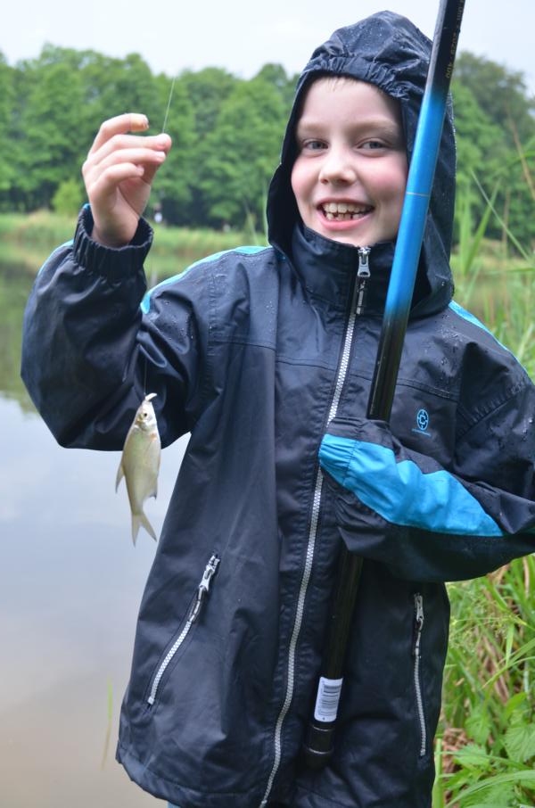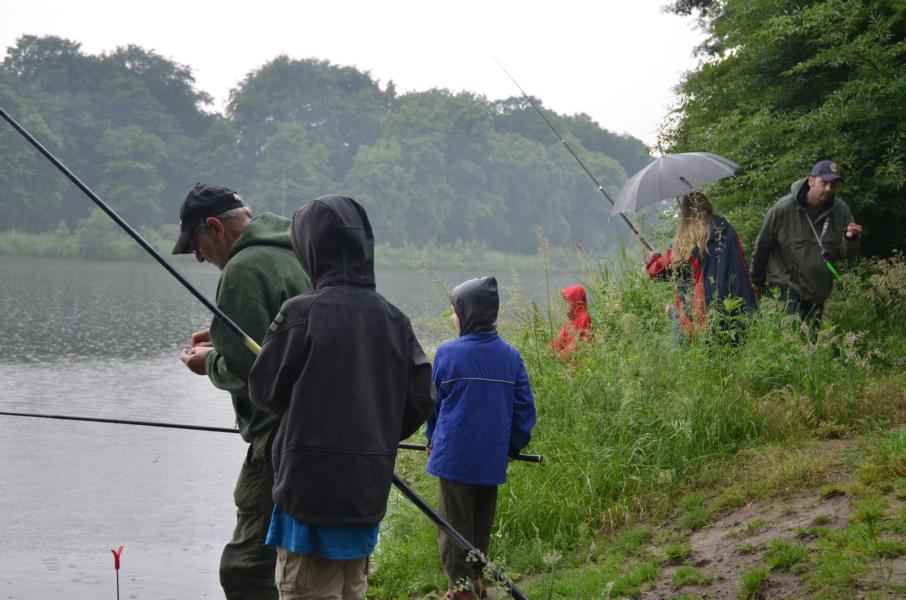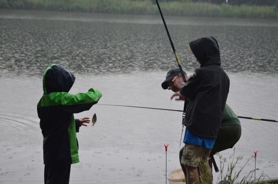 An diesem Tag sollten wir mit dem Wetter kein Glück haben. Trotz Regen erschienen allerdings dreizehn Kinder und Jugendliche um das Angeln näher kennen zu lernen. Mir standen wieder einige ehrenamtliche Helfer zur Seite, die sich alle Mühe gaben den Nachwuchs zu begeistern. Es dauerte auch nicht lange bis die ersten Fische gefangen wurden. Im Hintergrund war, neben dem Regen, immer wieder ein Donnern zu hören. Vereinzelt waren Blitze in der Ferne zu sehen. Leider zog das Gewitter nicht an uns vorbei. So mussten wir das Angeln nach nicht mal einer halben Stunde abbrechen. Auslöser dafür war ein ohrenbetäubend lauter Knall. Die Angelsachen blieben am Wasser und wir flüchteten zum nahegelegenen Bootshaus. Gerade noch rechtzeitig, bevor die Welt unterging. Wassermassen von oben, dazu Hagel gepaart mit heftigen Windböhen. Die Glücklichen, die sich auf die Hinterseite vom Bootshaus retten konnten versteckten sich in den Toilettenräumen. Als das Unwetter langsam wieder in normalen Regen überging, hieß es dann wieder ab ans Wasser. Einige ließen sich vorzeitig abholen, aber der Großteil ließ sich trotz Nässe nicht vom Angeln abhalten. Und die Fische bissen besser als zuvor. Abschließend kann man sagen, dieses Fischen stand unter dem Motto: Abenteuer Angeln. In der Natur können wir mehr erleben als vor jedem Bildschirm. Hier sitzen wir nicht in der ersten Reihe, hier sind wir mittendrin.