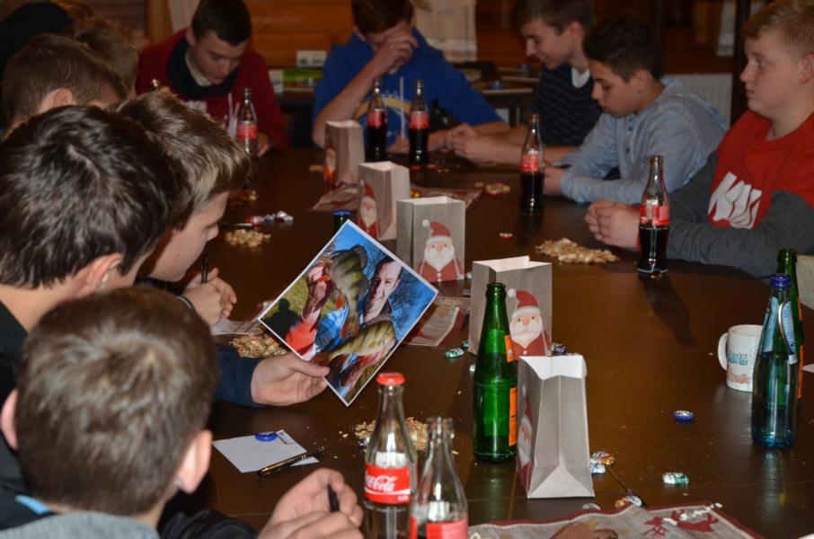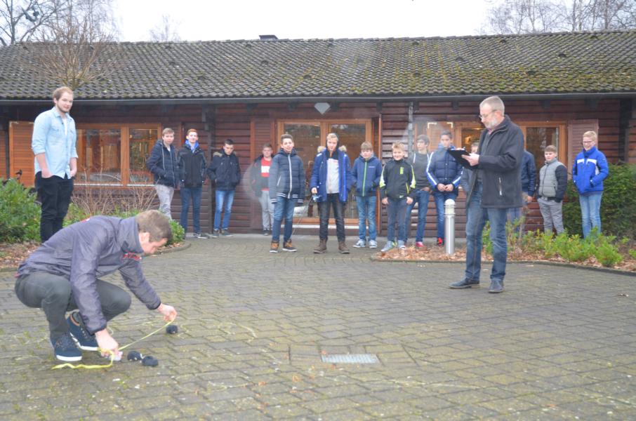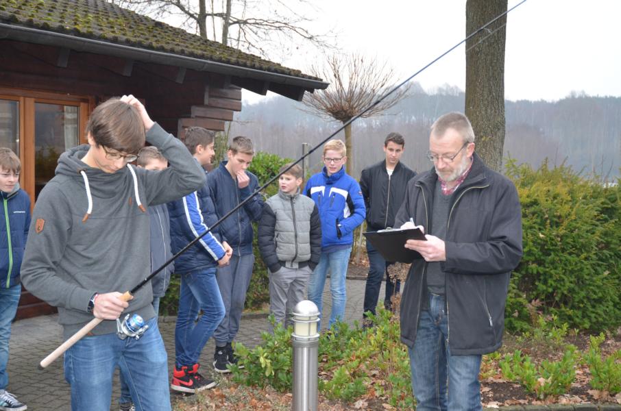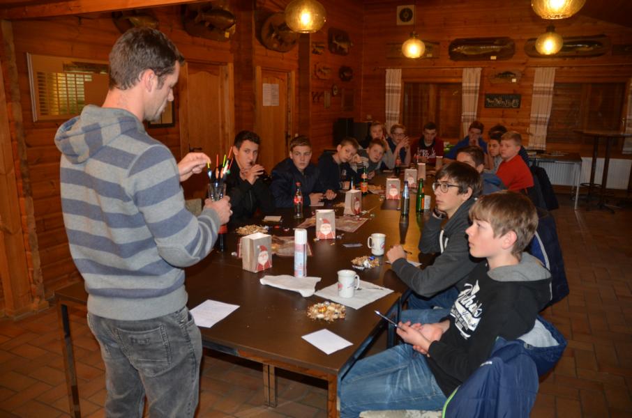 Zusammen mit Heiner, Willi, Jens und Alex konnten wir 15 Jungangler im Werner-Schwabe Haus in Sassenberg begrüßen. Damit es nicht zu langweilig wurde, hatte ich zwei Spiele vorbereitet. Das Erste fand draußen statt. Dazu hatte ich einen Teich, mit ein paar Fischen und Seerosenblättern auf den Boden gemalt. Aus einiger Entfernung durften die Jugendlichen ein kleines Säckchen, welches an eine Rute gebunden war (die Montage), in den "Teich" werfen. Und dann begann die eigentliche Aufgabe. Drei etwas größere Säckchen (das Futter) sollten so nah wie möglich an den kleinen Sack geworfen werden. Alex maß die Distanzen und Willi notierte alles auf den Zentimeter genau. Sollte ein Futtersack auf einem Seerosenblatt liegen bleiben, musste nochmal geworfen werden. Die dabei erzielte Distanz wurde dann doppelt gerechnet. Allerdings gab es nicht einen Strafwurf. Die Jungs machten ihre Sache wirklich gut. Ziel war es natürlich in der Summe die geringste Distanz zu erzielen. Nachdem alle an der Reihe waren, ging es zurück ins Vereinsheim. Dort wartete schon heißer Kakao mit Sprühsahne, den Jens vorbereitet hatte. Ein paar Minuten zum Quatschen, Plätzchen essen, Nüsse knacken, Fachsimpeln, was auch immer. Wir Betreuer ließen uns einen heißen Kaffee schmecken und Heiner wertete das erste Spiel aus. Nach gut zwanzig Minuten ging es mit einem "Angelquiz", bestehend aus sechs Fragen, weiter. Wie zum Beispiel: Was trägt eine der Posen? Wie viele Boilies sind in dem Glas? Wie schwer ist... ? Für jede annähernd richtige Antwort wurden zehn Zentimeter vom Ergebnis des ersten Spiels abgezogen. Es war eine spannende Sache und die Jungs waren mit Eifer dabei. Am Ende sollten die ersten vier Plätze prämiert werden. Aber es gab keinen vierten Platz, wir hatten zwei dritte Plätze: Paul Jürgens und Jonathan Schmidt. Beide bekamen eine Spule mit Schnur (gestiftet von Alex). Platz Zwei ging mit einem Gutschein an Roman Birkemeier und den ersten Platz sicherte sich Ron Brinkmann. Auch er erhielt einen Gutschein.