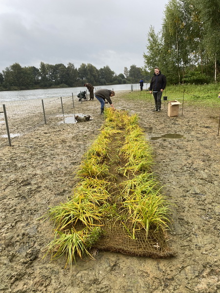 Die Pflanzmatten mit Röhricht wurden pünktlich geliefert. Damit die Enten und Gänse die jungen Pflanzen nicht als Festmahl betrachten wurden sie mit Zweigen abgedeckt. Am nächsten Morgen erfolgte der Transport mit dem Boot, vom Steg zur Insel im Schongebiet. Während einige Helfer noch mit dem Aufbau des Zauns beschäftigt waren, wurden zeitgleich die Pflanzmatten ausgerollt und mit Holznägeln am Boden fixiert. Jede Pflanzmatte war 1 Meter breit und 5 Meter lang. Bei 10 Matten sind das 50 m².