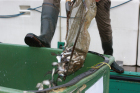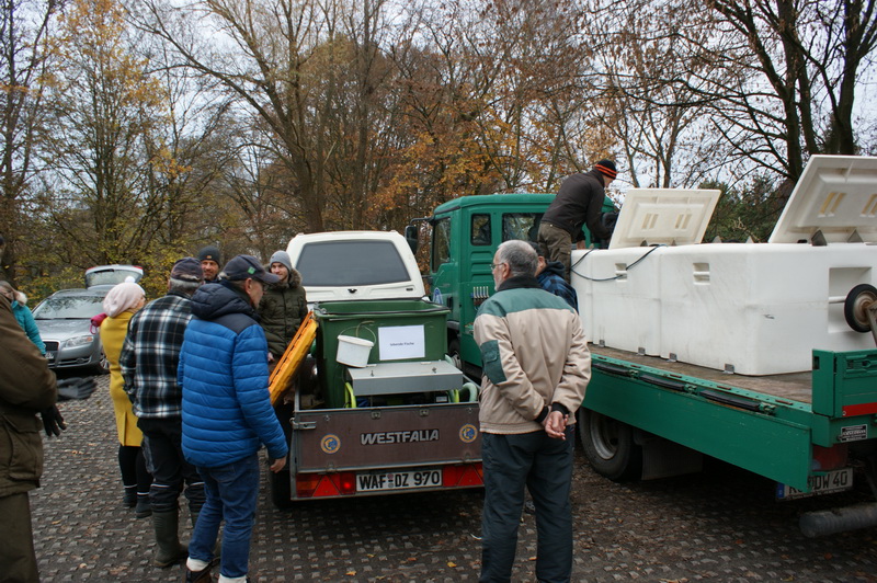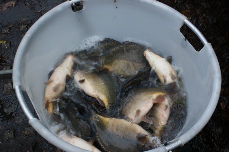 Da wir genügend Helfer hatten, kescherte der Fischzüchter die Fische zügig in die Bottiche.