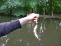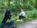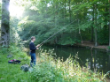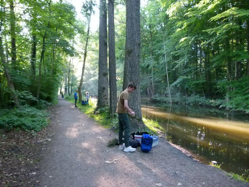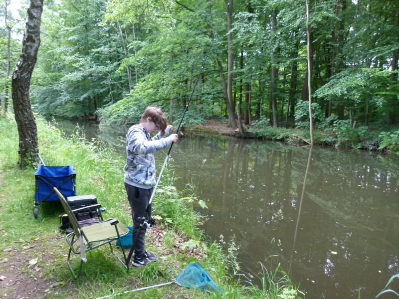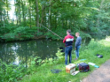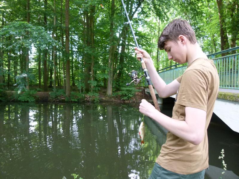 Schon beim Abstecken der Angelplätze konnten wir einige Fische an der Wasseroberfläche beobachten. Hier waren wir auf jeden Fall richtig. Und auch vom Wetter her hatten wir nichts zu beanstanden. Trotz Schatten, von den vielen Bäumen um uns herum, war es um sieben Uhr morgens schon angenehm warm. Neben fünf Jugendlichen war auch der amtierende König angetreten, um seinen Titel zu verteidigen. Es sollte also spannend werden. Tatsächlich wurden die ersten Fische relativ schnell gefangen. Aber es stellte sich heraus, dass sie zunehmend vorsichtiger bissen. Zu unserer Zufriedenheit konnte zwar jeder etwas fange aber wirklich eindeutig zeichnete sich noch kein König ab. Aufregung kam auf als eine größere Brasse an den Haken ging. Leider wurde sie dann direkt am Ufer verloren, ausgeschlitzt. Sehr ärgerlich! War das womöglich der Siegerfisch?