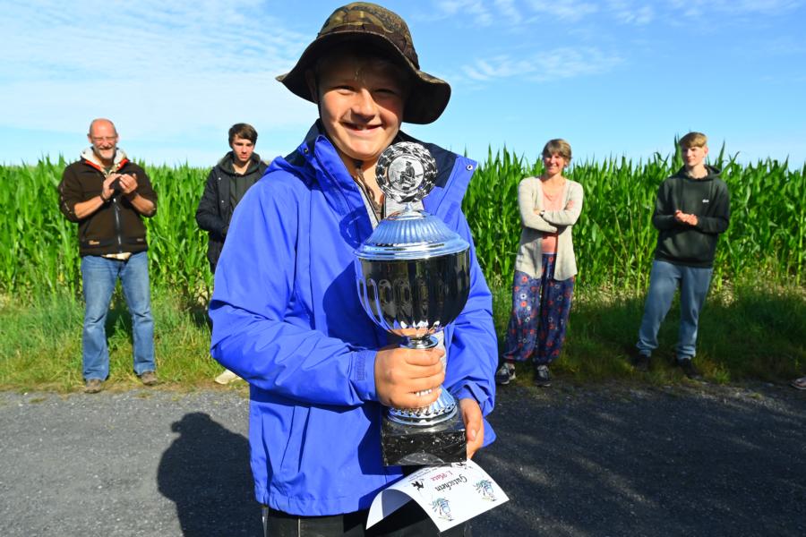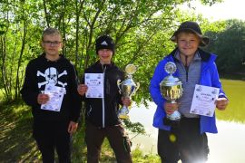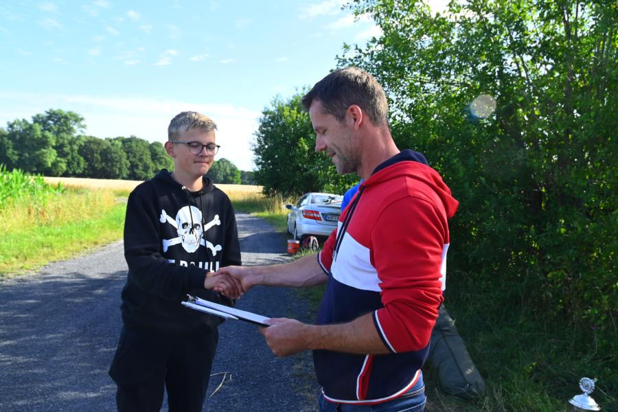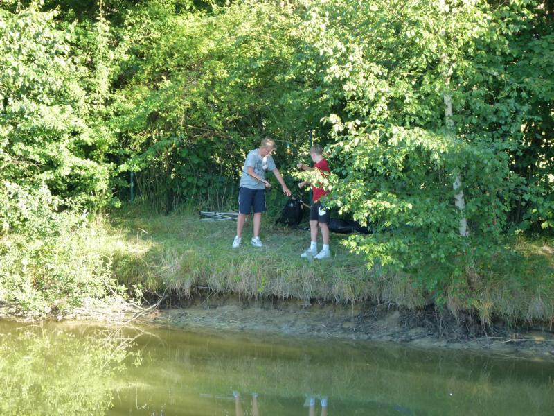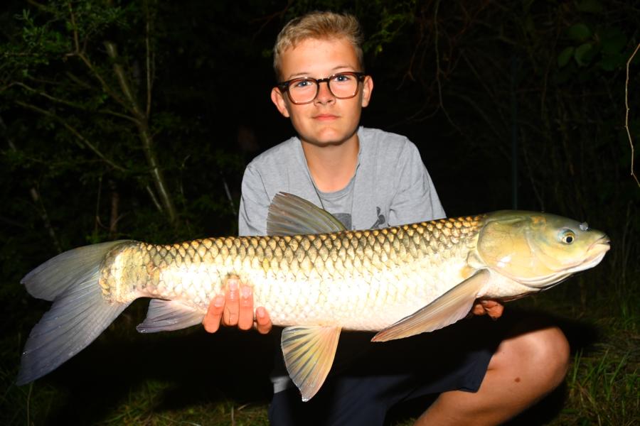 Die Karpfen waren da etwas dickfälliger. Schon nach kurzer Zeit gab es den ersten heftigen Biss. Leider ist der Haken im Kampf aufgebogen und damit hatte der Karpfen gewonnen. Eigentlich spricht man ja von einem Drill, aber bei einem Kräftemessen zwischen Jungangler und Karpfen passt Kampf für mein Empfinden irgendwie besser. Es sollte nicht lange dauern, bis es zu einer neuen Chance kam. Diesmal schwamm der Karpfen so schnell am verdutzten Jungangler vorbei, dass er wohl dachte, er hätte nichts mehr am Haken. Daraufhin drehte er die Bremse zu um einzuholen. Dann ging leider alles sehr schnell. Die Schnur spannte sich, die Rute wurde krumm gezogen und die Schnur konnte dem Druck nicht standhalten. Zwei zu Null für die Fische! Aber aller guten Dinge sind ja bekanntlich drei. Wieder ein rasanter Biss und wieder wollte es der Fisch seinem Gegner nicht leicht machen. Er flüchtete direkt in eine Buschreihe, die im Wasser hing. Nichts ging mehr, er hing irgendwo im Busch fest. Schnell holte Jens seine Wathose und begab sich ins Wasser, um den Fisch zu bergen. Und tatsächlich hing er noch am Haken und Jens konnte ihn keschern. Ein Graskarpfen! Mehrmals versuchte er aus dem Kescher zu springen. Gut, dass Jens als erfahrener Karpfenangler wusste was der Fisch versuchen würde. Letztlich übergab er ihn dann seinem überglücklichen Fänger.