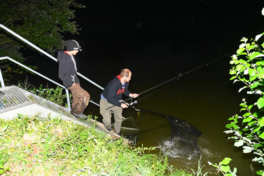 Nur eine Stunde später hallte dann ein Bissanzeiger durch die Nacht. Es piepte und piepte und piepte. Alles rufen: "Henry, du hast einen Biss!" half nichts. Mittlerweile rannten fast alle um den Teich. Roman war zuerst an der Angel und schlug an. Henry brauchte noch etwas um zu verstehen, was da grade passierte. Als Roman ihm die krumme Rute in die Hände drückte war er dann sofort hellwach. Und kurze Zeit später konnte er sich über einen Schuppenkarpfen freuen. Viel schöner kann ein Traum wohl nicht enden. Und knappe zwei Stunden später wiederholte sich der Vorgang. Nur das Henry jetzt etwas eher an der Angel war und den zweitschwersten Karpfen aus dem See fing. Petri Heil!
