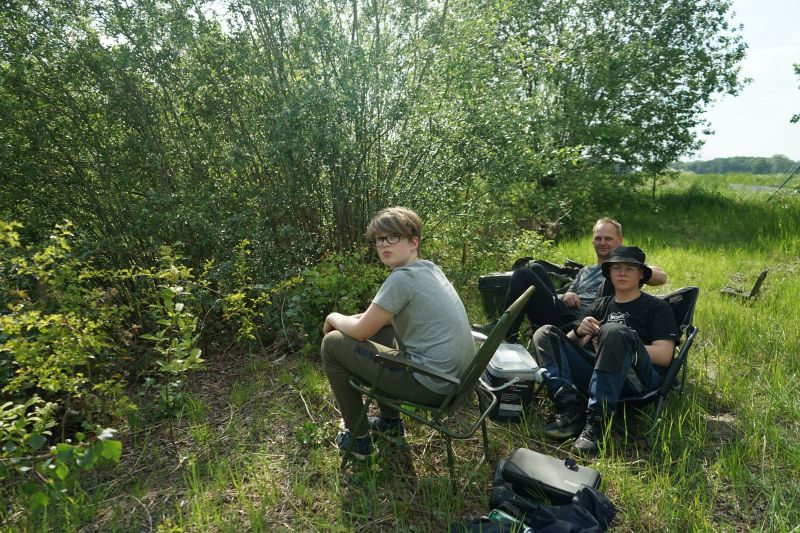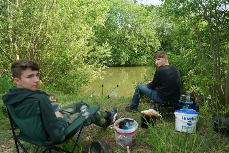 Ca. 2 Stunden später war dann aus der anderen Ecke des Teiches ein lautes Klatschen zu hören. Ole stand mit krummer Rute am Ufer und hatte einen Karpfen dran. Leider war dieser am Ufer mit der Schnur in einer Wurzel hängengeblieben. Auch mein Einsatz mit Wathose und Kescher ins Wasser zu gehen, um den Fisch zu landen, hatte nicht mehr geholfen. Der Fisch war bereits weg.