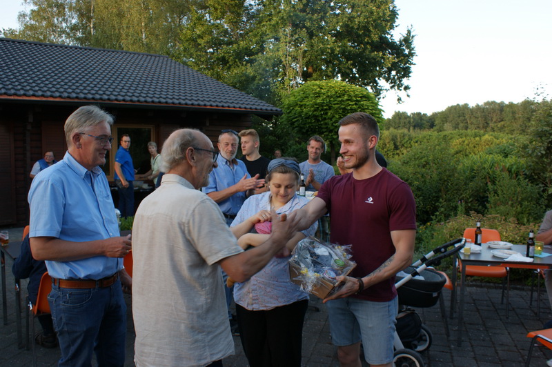 Zur Überraschung aller Mitglieder hatte der Vorstand für das jüngste Mitglied ein Präsent vorbereitet. Alex und Katie, mit Baby Claire Victoria auf dem Arm, freuten sich über den Kinderausweis, das erste Angleroutfit und den vielen Glückwünschen.
