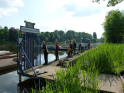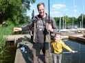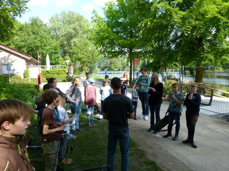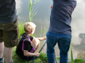 Wir durften uns über eine gute Beteiligung freuen. So hatten unsere sechs Betreuer alle Hände voll zu tun. 17 Teilnehmer, darunter zwei Erwachsene, ans Angeln heranzuführen war schon eine Aufgabe. Aber die wohl größte Herausforderung liegt im Aufrechterhalten der Motivation. Denn nicht immer beißen die Fische auf Ansage. Und es ist verständlich, dass es gerade für Kinder schnell langweilig wird, wenn nichts passiert. Daher nehmen wir es mit dem reinen Angeln auch nicht so genau. Der Spaß soll im Vordergrund stehen und da dürfen die Kleinen gerne am Wasser spielen, von links nach rechts laufen, gucken was die anderen machen und manchmal auch Fische bestaunen, die sie nicht selber gefangen haben. Gut, dass es in der Natur immer etwas zu entdecken gibt. Manchmal sind es die kleinen Fische an der Oberfläche oder wie bei diesem Mal, sogar ein Karpfen, der gemütlich seine Bahnen zog. Aber auch alle möglichen anderen Tiere gibt es zu entdecken, darunter auch kleine Nager, Enten, Haubentaucher, Frösche, Libellen, Muscheln und noch einiges mehr. Da war es schon etwas ganz Besonderes, wenn man das alles bei Sonnenschein und in einer immer grüner werdenden Umgebung erleben darf. Es war eine wirklich tolle Atmosphäre am Wasser und natürlich konnten auch wieder ein paar Fische gefangen werden. Darunter ein großes Rotauge und ein kleiner Barsch. Ihr wisst schon, der mit den Streifen.