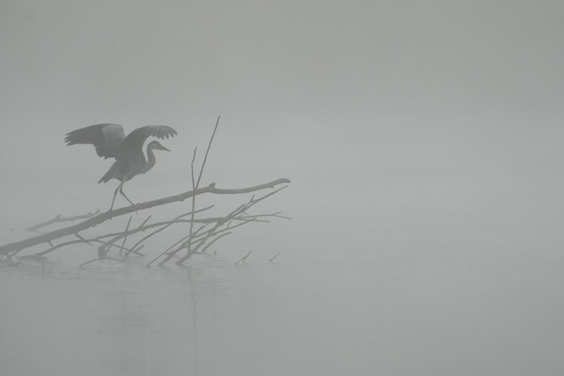 Dicke Nebelschwaden zogen im Morgengrauen auf, verschluckten das Licht der tiefstehenden Sonne und hüllten die Landschaft in eine beinahe gespenstische Stille. Vom Gröblinger See war nicht mehr viel zu erkennen.