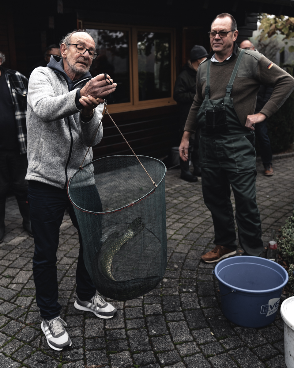 Als alle Teilnehmer um 13:00 Uhr am Vereinsheim zusammenkamen, war den darunter befindlichen sieben Fängern ihr Erfolg bereits an den Gesichtern abzulesen. Sobald Heiner das Wiegenetz enthüllte, präsentierten sie stolz jeder mindestens einen Hecht.