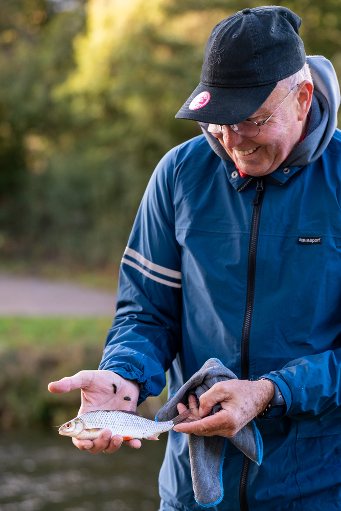 Die Ems führte klares Wasser und nur geringe Strömung – Bedingungen, die Präzision und Feingefühl erforderten. Die meisten Teilnehmer setzten auf Posenmontagen von zwei bis drei Gramm, fein ausgebleit und mit einer einzelnen Made bestückt. Die Bisse blieben meist zaghaft; oft war die Made nur leicht benagt, ohne dass der Fisch hängen blieb. Einige Angler versuchten ihr Glück mit Feederruten und Mini-Boilies, in der Hoffnung auf kapitale Döbel – doch die zeigten sich an diesem Tag schüchtern.