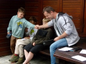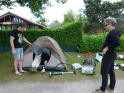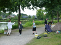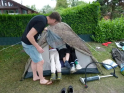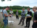 So konnten wir nur nach bestem Wissen und Gewissen die Angelplätze ausstecken. Bei unserer offiziellen Begrüßung erklärte ich den Junganglern die Situation und worauf sie achten sollten, wenn sie mehr als nur ein paar Weißfische fangen wollten. Für unser Angeln selbst gab es einige Zugeständnisse für die Jugend. So durften sie mit zwei Ruten angeln, sie durften dem Raubfisch nachstellen und es war für sie erlaubt in dieser Nacht ein Zelt zu nutzen. Was auch nötig war, denn kurz nachdem es ans Wasser ging, fing es richtig an zu schütten. Nur gut, dass der Regen nicht lange anhielt. Doch trotz des trockenen Wetters, gab es gleich zwei, die so richtig nass wurden. Einmal Roman, einer unser Betreuer, der freiwillig ins Wasser ging, um einen abgestürzten Ballon zu retten. Ich hatte ihm gesagt, dass da bestimmt 50 Euro dranhängen. Was sich als falsch herausstellte. Es war nur eine Karte auf der „Schön, dass du da bist!" stand. Und dann landete einer der jüngeren Teilnehmer völlig unfreiwillig im See. Manchmal zahlt es sich tatsächlich aus, wenn Eltern mitdenken und Wechselklamotten einpacken.