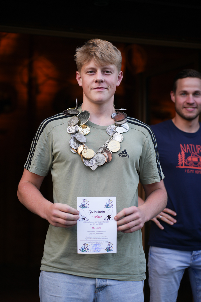 Nach dem Essen wurde es noch einmal offiziell: Die Siegerehrung des vergangenen Königsangelns stand auf dem Programm. In der Jugendwertung sicherte sich Johann Waten den Titel und durfte sich über die Königskette freuen. Bei den Senioren ging der Sieg an Heiner Alck, der damit nicht zum ersten Mal auf dem Thron steht – vielmehr wurde ihm die Königskette nun schon zum siebten Mal feierlich umgelegt – ein Titel, für den es eigentlich gar keine offizielle Bezeichnung mehr gibt. Ehrenkaiser? Zar der Ems? Uns gehen langsam die Namen aus ...