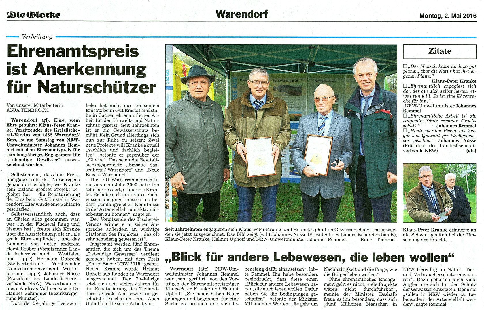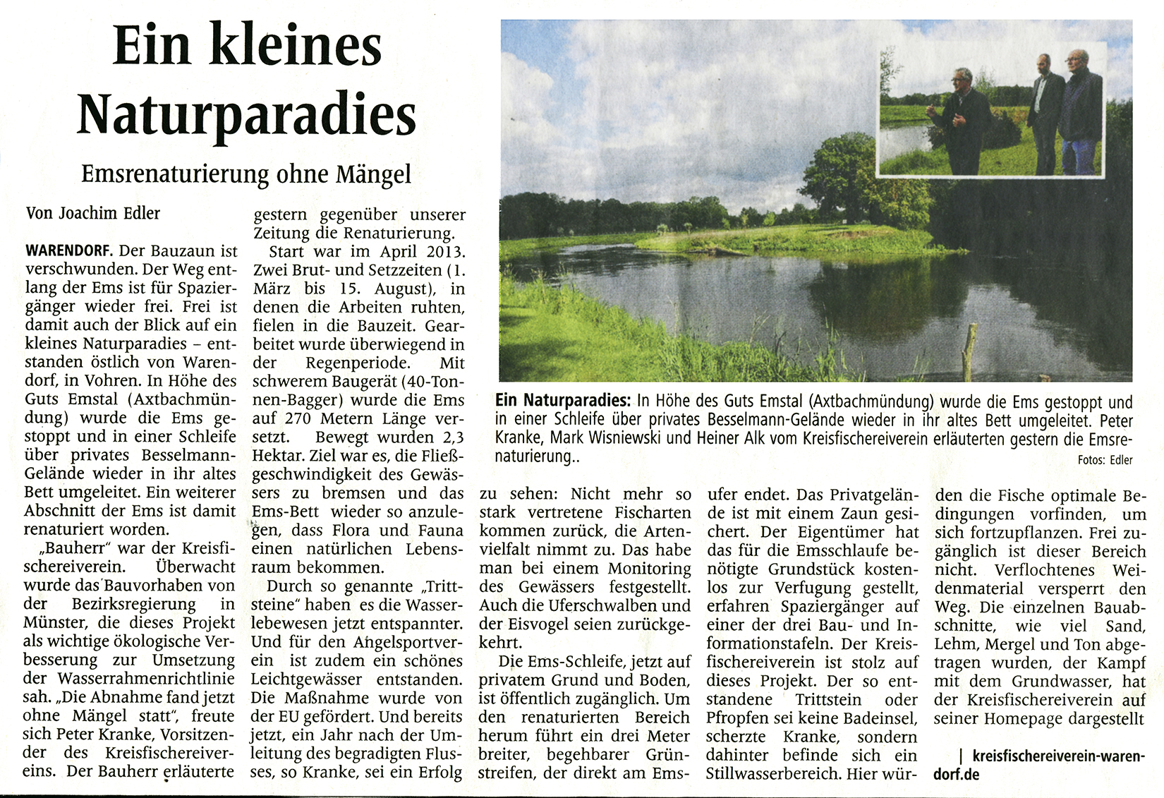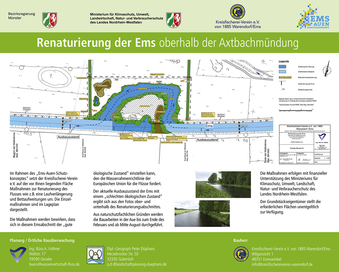 Der Kreisfischerei-Verein Warendorf/Ems führt in eigener Verantwortung die Renaturierung der Ems oberhalb der Axtbachmündung durch. Mit eigenen finanziellen Mitteln und großem ehrenamtlichen Einsatz renaturiert der Verein in Zusammenarbeit mit der Bezirksregierung Münster einen Abschnitt der Ems.