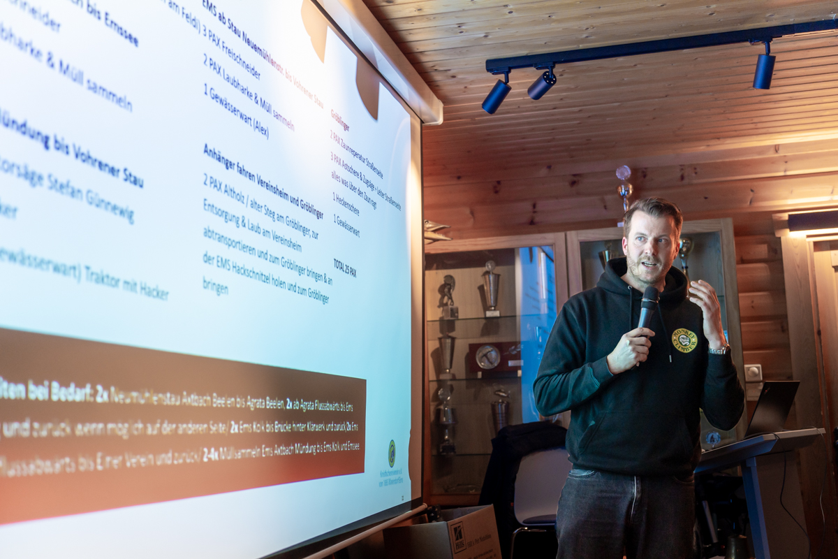 Gewässerwart Mathis Korn stellte in einer Präsentation die Arbeiten der Gewässerdienste vor und lobte die hervorragende Beteiligung sowie das große Engagement der Helfer. Gleichzeitig wies er darauf hin, dass die Beteiligung inzwischen teilweise das tatsächliche Arbeitsaufkommen übersteige, und stellte geplante Projekte für 2026 vor.