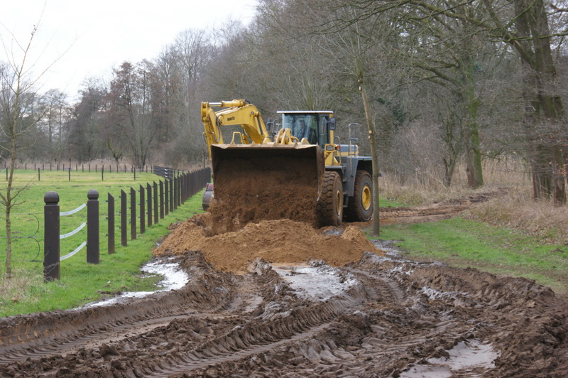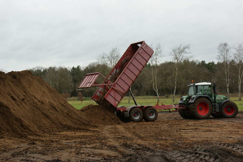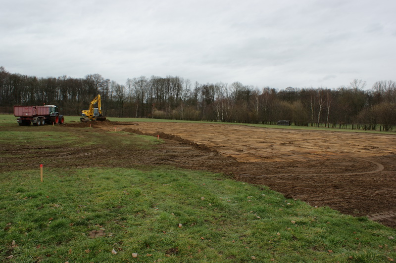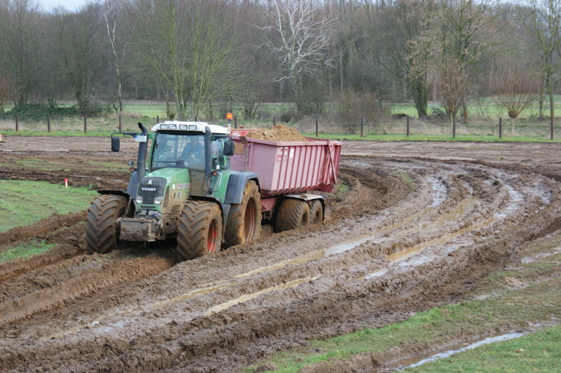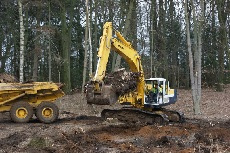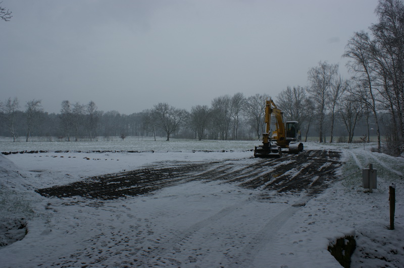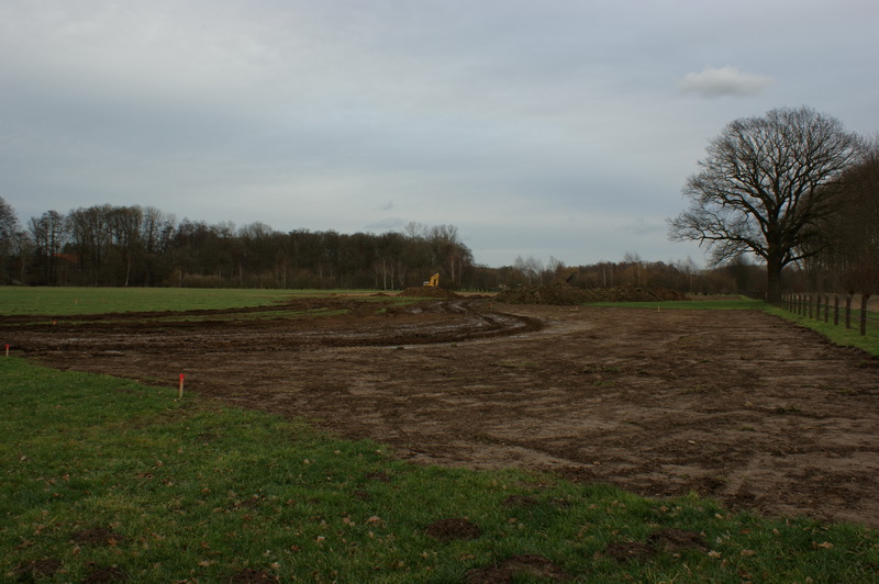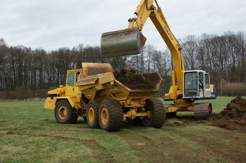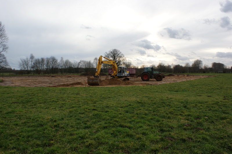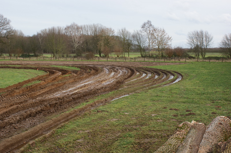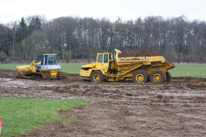 Durch den Abtrag der Grasnabe und des Mutterbodens ist der zukünftige Neuverlauf der Ems zu erkennen. Die großen Maschinen kamen an ihre Grenzen und blieben mehrmals stecken.