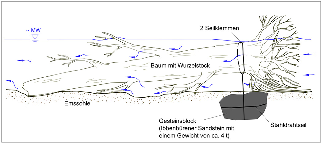 Hochwasserabflüsse bewirken große Strömungskräfte auf das positionierte Totholz (Auftriebs-, Stoßdruckkräfte). Ein Abtreiben kann aus Gründen des Objektschutzes außerhalb des Maßnahmengebietes nicht zugelassen werden, das Totholz wird daher auftriebssicher mit einem emstypischen Naturstein über ein Stahldrahtseil in Handarbeit verankert. Der Naturstein wird mit Lastkraftwagen antransportiert und mit einem Bagger in die Sohle der Ems eingebaut.