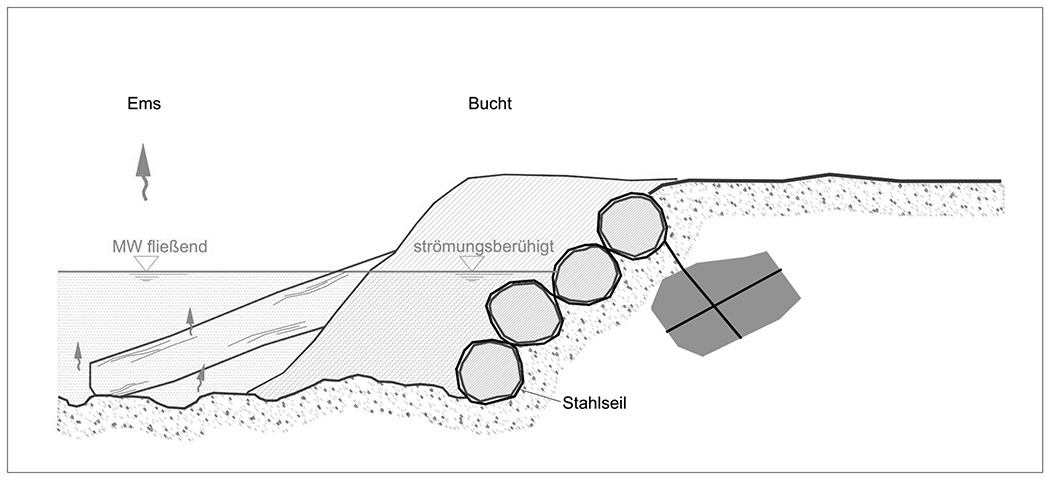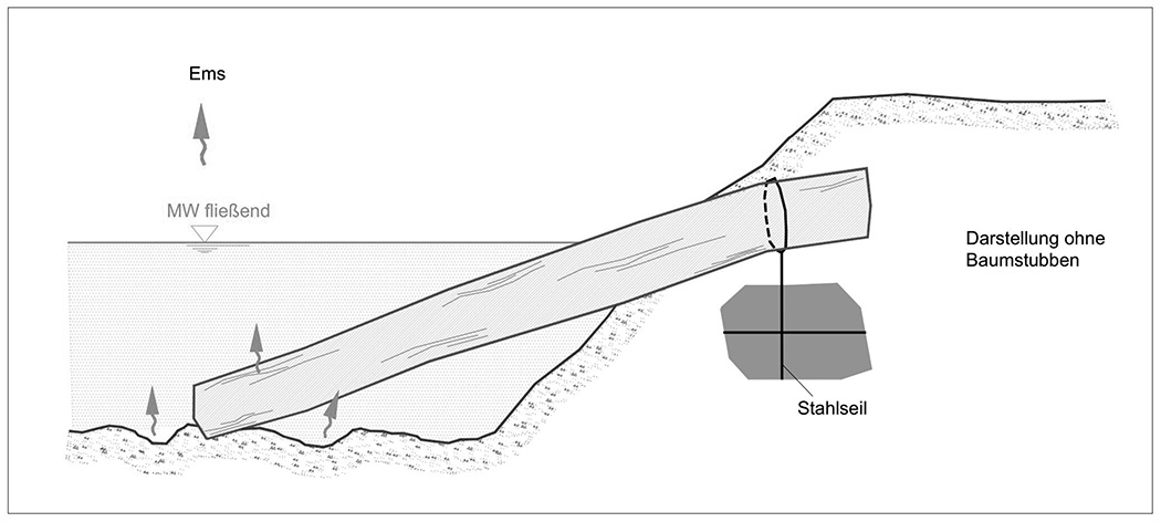 Bäume werden im Bereich einer Bucht aufgeschichtet. Hierdurch kann eine Böschungsstabilisierung an Prallhängen bei gleichzeitiger Erhöhung der Strömungsvielfalt in Abschnitten geschaffen werden, bei denen keine voranschreitende Laufmigration der Ems wegen eingeschränkter Platzverhältnisse zugelassen werden kann.