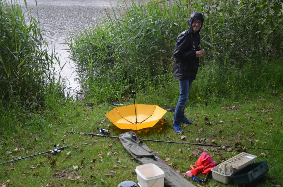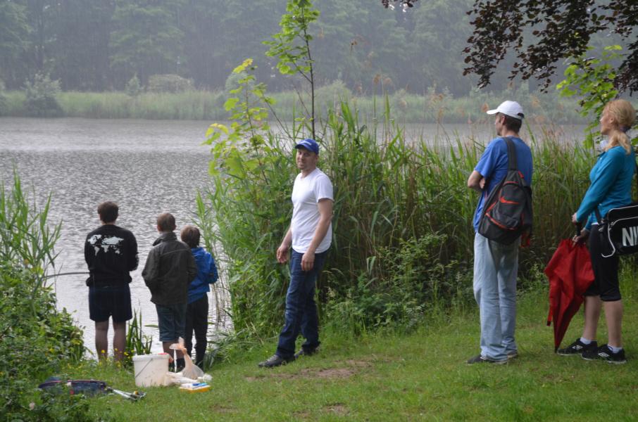 An diesem Tag sollten wir mit dem Wetter kein Glück haben. Trotz Regen erschienen allerdings dreizehn Kinder und Jugendliche um das Angeln näher kennen zu lernen. Mir standen wieder einige ehrenamtliche Helfer zur Seite, die sich alle Mühe gaben den Nachwuchs zu begeistern. Es dauerte auch nicht lange bis die ersten Fische gefangen wurden. Im Hintergrund war, neben dem Regen, immer wieder ein Donnern zu hören. Vereinzelt waren Blitze in der Ferne zu sehen. Leider zog das Gewitter nicht an uns vorbei. So mussten wir das Angeln nach nicht mal einer halben Stunde abbrechen. Auslöser dafür war ein ohrenbetäubend lauter Knall. Die Angelsachen blieben am Wasser und wir flüchteten zum nahegelegenen Bootshaus. Gerade noch rechtzeitig, bevor die Welt unterging. Wassermassen von oben, dazu Hagel gepaart mit heftigen Windböhen. Die Glücklichen, die sich auf die Hinterseite vom Bootshaus retten konnten versteckten sich in den Toilettenräumen. Als das Unwetter langsam wieder in normalen Regen überging, hieß es dann wieder ab ans Wasser. Einige ließen sich vorzeitig abholen, aber der Großteil ließ sich trotz Nässe nicht vom Angeln abhalten. Und die Fische bissen besser als zuvor. Abschließend kann man sagen, dieses Fischen stand unter dem Motto: Abenteuer Angeln. In der Natur können wir mehr erleben als vor jedem Bildschirm. Hier sitzen wir nicht in der ersten Reihe, hier sind wir mittendrin.