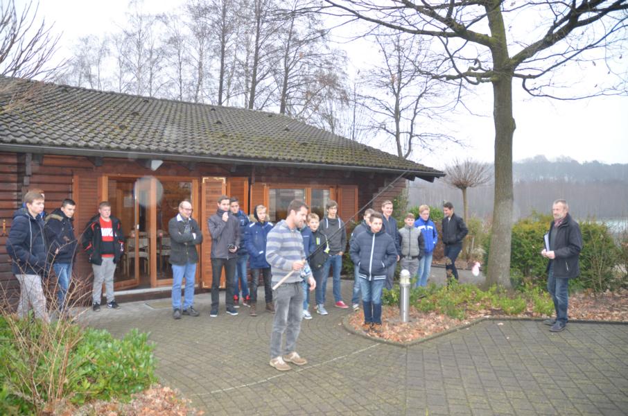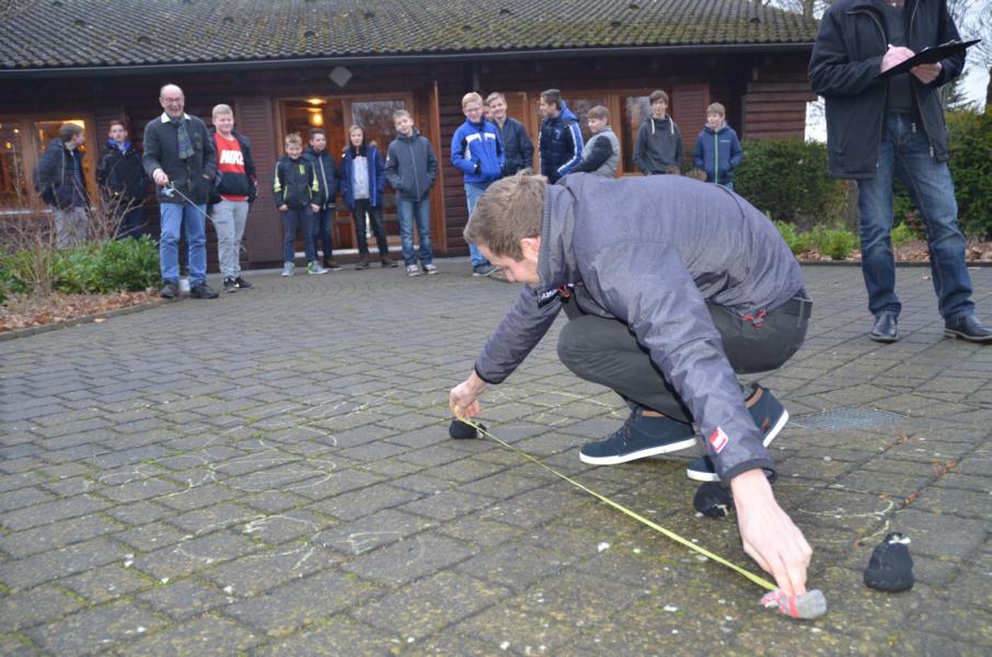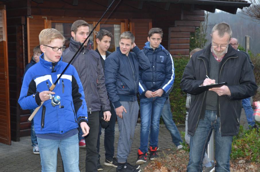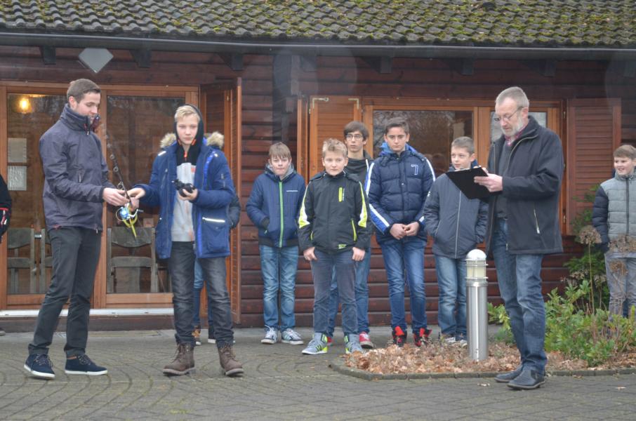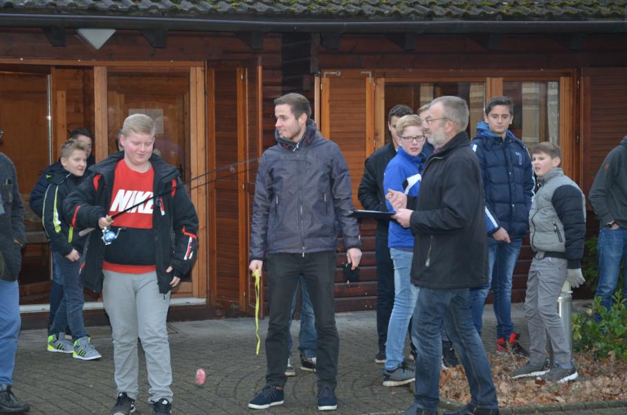 Zusammen mit Heiner, Willi, Jens und Alex konnten wir 15 Jungangler im Werner-Schwabe Haus in Sassenberg begrüßen. Damit es nicht zu langweilig wurde, hatte ich zwei Spiele vorbereitet. Das Erste fand draußen statt. Dazu hatte ich einen Teich, mit ein paar Fischen und Seerosenblättern auf den Boden gemalt. Aus einiger Entfernung durften die Jugendlichen ein kleines Säckchen, welches an eine Rute gebunden war (die Montage), in den "Teich" werfen. Und dann begann die eigentliche Aufgabe. Drei etwas größere Säckchen (das Futter) sollten so nah wie möglich an den kleinen Sack geworfen werden. Alex maß die Distanzen und Willi notierte alles auf den Zentimeter genau. Sollte ein Futtersack auf einem Seerosenblatt liegen bleiben, musste nochmal geworfen werden. Die dabei erzielte Distanz wurde dann doppelt gerechnet. Allerdings gab es nicht einen Strafwurf. Die Jungs machten ihre Sache wirklich gut. Ziel war es natürlich in der Summe die geringste Distanz zu erzielen. Nachdem alle an der Reihe waren, ging es zurück ins Vereinsheim. Dort wartete schon heißer Kakao mit Sprühsahne, den Jens vorbereitet hatte. Ein paar Minuten zum Quatschen, Plätzchen essen, Nüsse knacken, Fachsimpeln, was auch immer. Wir Betreuer ließen uns einen heißen Kaffee schmecken und Heiner wertete das erste Spiel aus. Nach gut zwanzig Minuten ging es mit einem "Angelquiz", bestehend aus sechs Fragen, weiter. Wie zum Beispiel: Was trägt eine der Posen? Wie viele Boilies sind in dem Glas? Wie schwer ist... ? Für jede annähernd richtige Antwort wurden zehn Zentimeter vom Ergebnis des ersten Spiels abgezogen. Es war eine spannende Sache und die Jungs waren mit Eifer dabei. Am Ende sollten die ersten vier Plätze prämiert werden. Aber es gab keinen vierten Platz, wir hatten zwei dritte Plätze: Paul Jürgens und Jonathan Schmidt. Beide bekamen eine Spule mit Schnur (gestiftet von Alex). Platz Zwei ging mit einem Gutschein an Roman Birkemeier und den ersten Platz sicherte sich Ron Brinkmann. Auch er erhielt einen Gutschein.