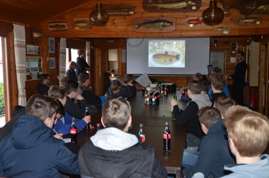 Zunächst ging Alexander auf den Döbel als Fisch ein. Wie erkennen wir ihn? In welcher Region lebt er? Wo hält er sich am liebsten auf? Danach erklärte er seine Art der Oberflächenmontage und was man neben dem Gerät sonst noch so alles brauchen kann. Natürlich gab es auch eine praktische Einheit. So wurde ein Verbindungsknoten von zwei Schnüren erklärt und anschließend selber gebunden. Als kleine Überraschung hatte Alexander noch einige Angelsachen aussortiert, die er den Jugendlichen schenkte.