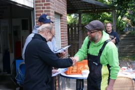 Nachdem alle ihre Angelplätze erreicht und eingerichtet hatten, konnte es um 20.00 Uhr endlich losgehen. Jeder versuchte mit seiner eigenen Methode zum Erfolg zu kommen. Wobei natürlich diejenigen die ersten Fangerfolge vorweisen konnten, die es gezielt auf Weißfisch abgesehen hatten. Doch auch die Chancen auf Aal, Brassen, Karpfen oder Schleien standen nicht schlecht, da das Wasser mit 19 Grad tatsächlich schon sommerlich warm war. Erschwert wurden die Bedingungen allerdings durch die Massen an Pappelsamen auf der Wasseroberfläche. Diese sogenannte „Pappelwolle" setzt sich an der Schnur fest und verstopft im schlimmsten Fall die Ringe an der Angelrute. Bedingt durch die wechselnden Windrichtungen, in Verbindung mit der konstanten Strömung durch das eingeleitete Emswasser, hatten aber wohl alle Angler zu irgendeinem Zeitpunkt mit dieser Gegebenheit zu kämpfen. Gerade in der Dunkelheit eine nicht ganz einfache Herausforderung. Nach einer relativ kühlen Nacht wurde noch bis 7.00 Uhr gefischt, ehe es dann zum obligatorischen Frühstück wieder zum Bootshaus ging. Bei Kaffee und Brötchen konnten alle Erlebnisse der vergangenen Stunden mit den Angelkollegen geteilt werden. Tatsächlich konnten neben zahlreichen Weißfischen auch Aal und Karpfen gefangen werden. Ein Vereinsmitglied hätte sogar fast eine Schleie überlistet, hätte diese es sich nicht kurz vor dem Kescher noch anders überlegt. Im Vergleich zu den letzten Jahren wurden allerdings weniger Brassen gefangen, was eventuell mit dem diesjährigen Laichgeschäft der Tiere zu tun haben könnte.