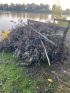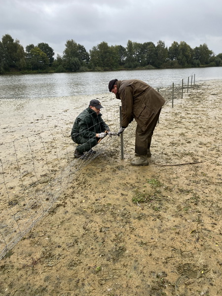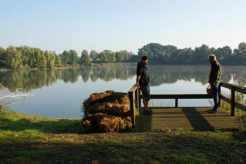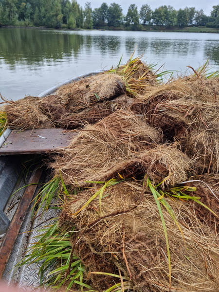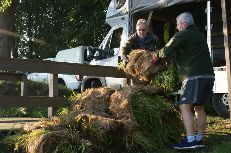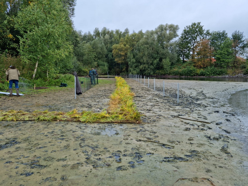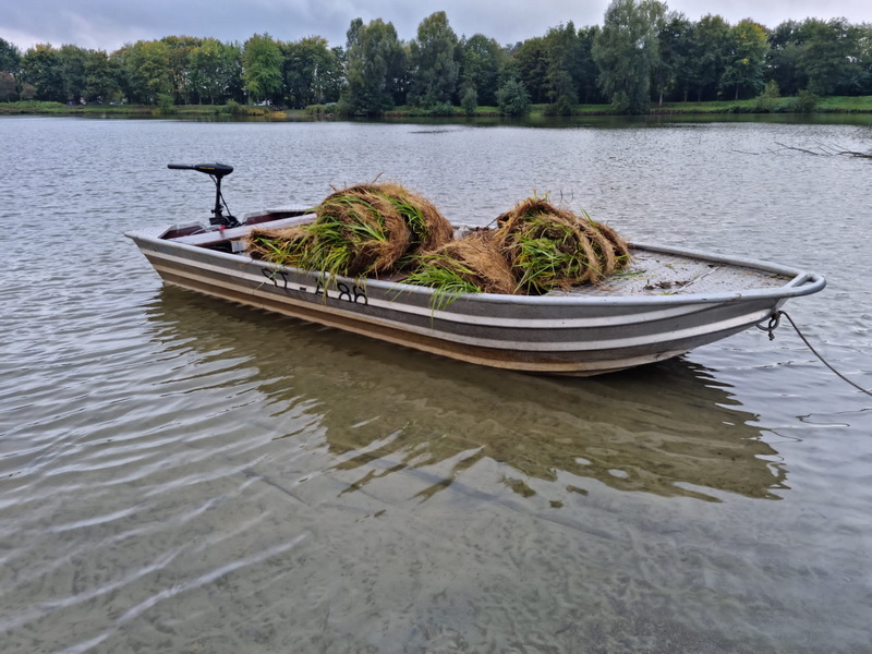 Die Pflanzmatten mit Röhricht wurden pünktlich geliefert. Damit die Enten und Gänse die jungen Pflanzen nicht als Festmahl betrachten wurden sie mit Zweigen abgedeckt. Am nächsten Morgen erfolgte der Transport mit dem Boot, vom Steg zur Insel im Schongebiet. Während einige Helfer noch mit dem Aufbau des Zauns beschäftigt waren, wurden zeitgleich die Pflanzmatten ausgerollt und mit Holznägeln am Boden fixiert. Jede Pflanzmatte war 1 Meter breit und 5 Meter lang. Bei 10 Matten sind das 50 m².