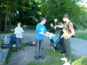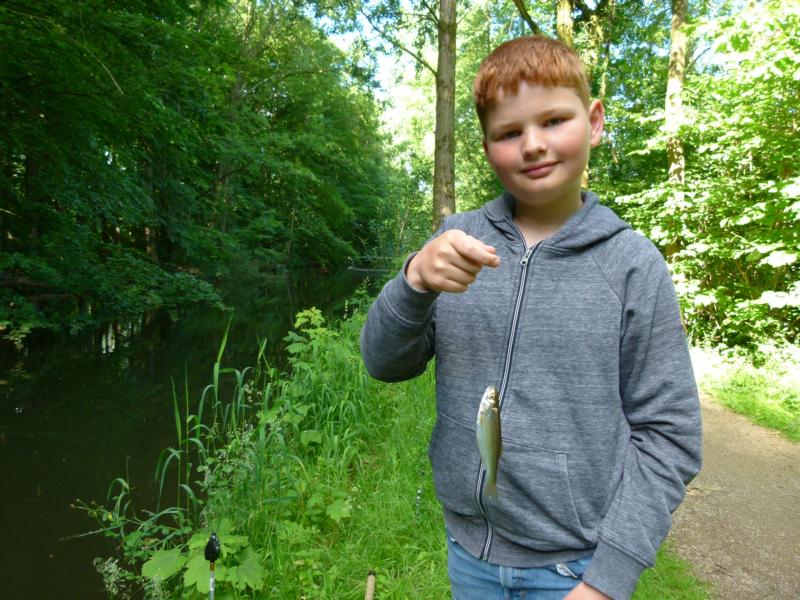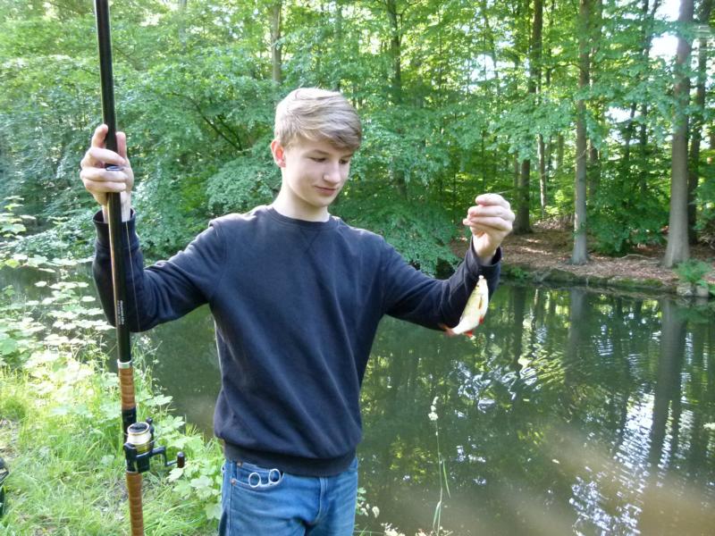 Schon beim Abstecken der Angelplätze konnten wir einige Fische an der Wasseroberfläche beobachten. Hier waren wir auf jeden Fall richtig. Und auch vom Wetter her hatten wir nichts zu beanstanden. Trotz Schatten, von den vielen Bäumen um uns herum, war es um sieben Uhr morgens schon angenehm warm. Neben fünf Jugendlichen war auch der amtierende König angetreten, um seinen Titel zu verteidigen. Es sollte also spannend werden. Tatsächlich wurden die ersten Fische relativ schnell gefangen. Aber es stellte sich heraus, dass sie zunehmend vorsichtiger bissen. Zu unserer Zufriedenheit konnte zwar jeder etwas fange aber wirklich eindeutig zeichnete sich noch kein König ab. Aufregung kam auf als eine größere Brasse an den Haken ging. Leider wurde sie dann direkt am Ufer verloren, ausgeschlitzt. Sehr ärgerlich! War das womöglich der Siegerfisch?