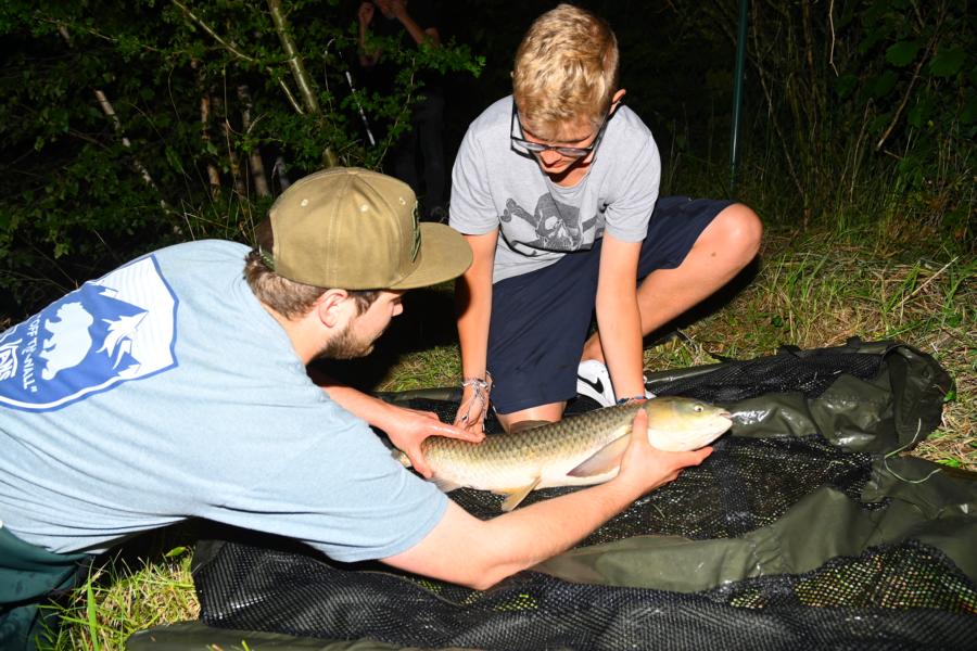Bei den warmen Temperaturen gab es quasi zur Begrüßung erstmal ein Eis, welches gleichzeitig als Los für die Angelstellen diente. In Zweierteams ging es dann ans Wasser. Da der Teich überschaubar war und zusätzlich einiges an Wasser fehlte, einigten wir uns darauf nur mit einer Rute zu angeln. Allerdings stellten wir den Jungs frei, auf was sie angeln. Somit durften sie ihr Glück auch auf Raubfisch versuchen. Im Teich lockten nämlich neben einigen Karpfen und Schleien auch große Aale und Zander. Also für jeden etwas dabei. Das wir den Jungs eindrücklich gesagt hatten, sie sollten sich besser so ruhig wie möglich an kleinen Gewässern verhalten, war scheinbar schnell wieder vergessen. Zumindest die Alten, also wir als Betreuer, waren uns sicher, es hätte mehr gefangen werden können. Aber bei so einem Event sollte der Spaß im Vordergrund stehen und wir verzichteten auf den erhobenen Zeigefinger. Auch wenn das für uns eine Nacht mit sehr wenig Schlaf bedeutete. Die Raubfische sahen das scheinbar nicht ganz so locker und blieben lieber im Wasser. Lediglich ein Breitkopfaal hatte dann doch etwas zu viel Hunger.