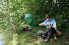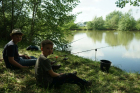 Ca. 2 Stunden später war dann aus der anderen Ecke des Teiches ein lautes Klatschen zu hören. Ole stand mit krummer Rute am Ufer und hatte einen Karpfen dran. Leider war dieser am Ufer mit der Schnur in einer Wurzel hängengeblieben. Auch mein Einsatz mit Wathose und Kescher ins Wasser zu gehen, um den Fisch zu landen, hatte nicht mehr geholfen. Der Fisch war bereits weg.