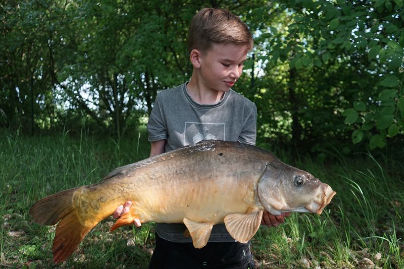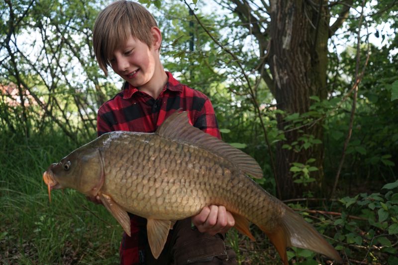Nach dieser Aufregung ging es dann schneller. Diesmal war es Laurin, der einen Karpfen haken konnte. Nach kurzem spritzigem Drill konnte er einen tollen Schuppenkarpfen präsentieren.