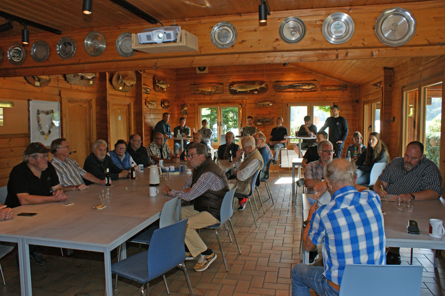 28 Teilnehmer erfuhren einiges über die bisher geleisteten Arbeitsstunden der Mitglieder und des Vorstandes. 135 Mitglieder leisteten bisher 791 Stunden für die Pflege der Gewässer und dem repräsentativen Eindruck von unserem Vereinsgelände. An 10 Sonderdiensten nahmen 33 Mitglieder teil. Dazu zählt der allgemeine Fischbesatz, Baum Fällaktionen, Besatz von Quappen-Brut und vorgestreckten Quappen, sowie Besatz von Farmaalen, um nur einige Sonderdienste zu nennen. In diesem Jahr wächst das Gras bei dem feucht-warmen Wetter besonders gut und die Gewässerwarte sind dankbar um jede Unterstützung der Mitglieder.