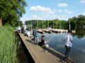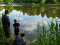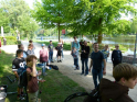 Wir durften uns über eine gute Beteiligung freuen. So hatten unsere sechs Betreuer alle Hände voll zu tun. 17 Teilnehmer, darunter zwei Erwachsene, ans Angeln heranzuführen war schon eine Aufgabe. Aber die wohl größte Herausforderung liegt im Aufrechterhalten der Motivation. Denn nicht immer beißen die Fische auf Ansage. Und es ist verständlich, dass es gerade für Kinder schnell langweilig wird, wenn nichts passiert. Daher nehmen wir es mit dem reinen Angeln auch nicht so genau. Der Spaß soll im Vordergrund stehen und da dürfen die Kleinen gerne am Wasser spielen, von links nach rechts laufen, gucken was die anderen machen und manchmal auch Fische bestaunen, die sie nicht selber gefangen haben. Gut, dass es in der Natur immer etwas zu entdecken gibt. Manchmal sind es die kleinen Fische an der Oberfläche oder wie bei diesem Mal, sogar ein Karpfen, der gemütlich seine Bahnen zog. Aber auch alle möglichen anderen Tiere gibt es zu entdecken, darunter auch kleine Nager, Enten, Haubentaucher, Frösche, Libellen, Muscheln und noch einiges mehr. Da war es schon etwas ganz Besonderes, wenn man das alles bei Sonnenschein und in einer immer grüner werdenden Umgebung erleben darf. Es war eine wirklich tolle Atmosphäre am Wasser und natürlich konnten auch wieder ein paar Fische gefangen werden. Darunter ein großes Rotauge und ein kleiner Barsch. Ihr wisst schon, der mit den Streifen.