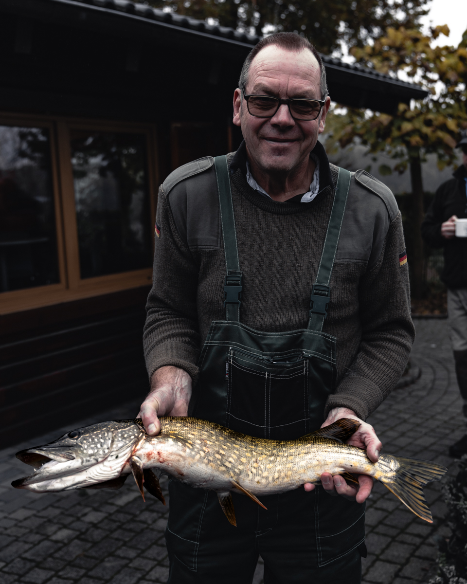 Als alle Teilnehmer um 13:00 Uhr am Vereinsheim zusammenkamen, war den darunter befindlichen sieben Fängern ihr Erfolg bereits an den Gesichtern abzulesen. Sobald Heiner das Wiegenetz enthüllte, präsentierten sie stolz jeder mindestens einen Hecht.