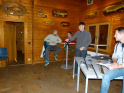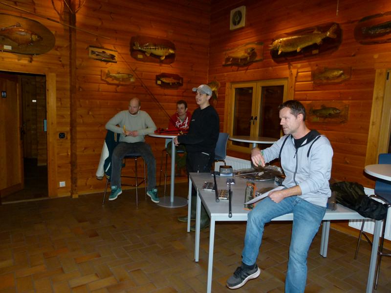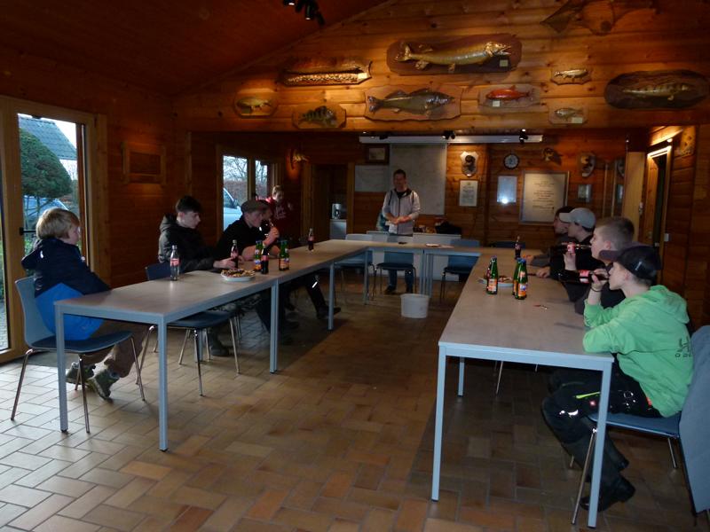 Für die letzte Stunde ging es dann ins Vereinsheim. Immerhin hatten wir auch etwas von Weihnachtsfeier in der Einladung geschrieben. Nachdem unsere Siegerehrung durch eine Fehleranalyse ersetzt wurde, gab es eine weitere Möglichkeit drei Gutscheine zu gewinnen. Wir veranstalteten ein Casting im Vereinsheim. Eigentlich waren es zwei Eimer in unterschiedlicher Größe, die getroffen werden sollten, aber der eine oder andere Wurf ging gefährlich nah an ein Hechtpräparat. Reiner Zufall, passte aber irgendwie zu unserem kleinen Raubfischangeln. Nach drei Durchgängen mit je drei Würfen und einer Menge Spaß, standen drei Gewinner fest. Laurin gewann vor Theo und Johann. Zum Abschluss durfte sich jeder Teilnehmer etwas von unserem Gabentisch aussuchen. Natürlich gab es jede Menge Angelsachen vom Weihnachtsmann. Wer brav war, also am häufigsten an unseren Veranstaltungen teilgenommen hatte, durfte zuerst an die Geschenke. Bei gleicher Teilnahme gab es ein Stechen, welches durch ein weiteres Zielwerfen entschieden wurde.