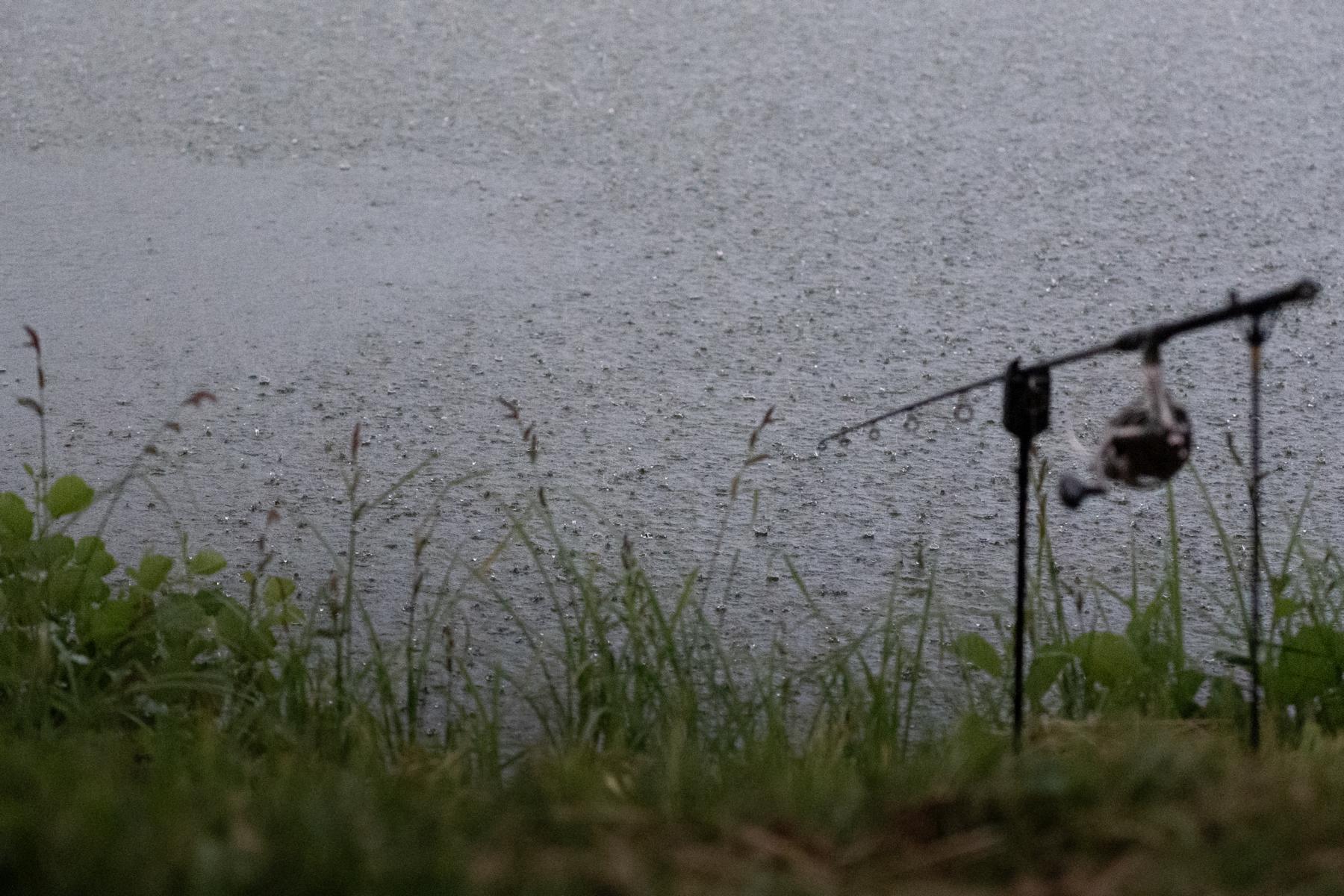 Zugute kam den Anglern der Umstand einer kurzen Regenpause zu Beginn des Fischens – gerade Zeit genug, um Zelte und Schirme in Stellung zu bringen. Doch kaum war der letzte Hering eingeschlagen, öffnete Petrus seine Pforten. Und wie! Innerhalb weniger Minuten verwandelte sich das Gelände in ein feuchtes Biotop. Was nicht rechtzeitig unter Dach gebracht worden war, wurde klatschnass – ebenso wie so mancher Angler, der in der Eile dem unbarmherzig niederprasselnden Dauerregen nicht entkommen war.