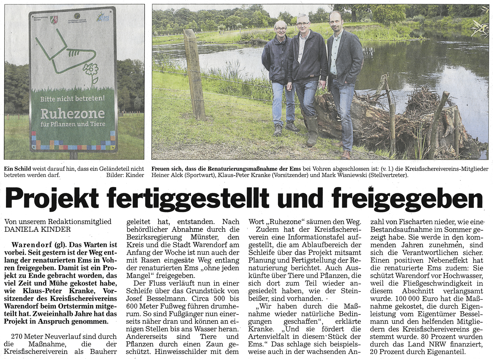 Der Kreisfischerei-Verein Warendorf/Ems führt in eigener Verantwortung die Renaturierung der Ems oberhalb der Axtbachmündung durch. Mit eigenen finanziellen Mitteln und großem ehrenamtlichen Einsatz renaturiert der Verein in Zusammenarbeit mit der Bezirksregierung Münster einen Abschnitt der Ems.