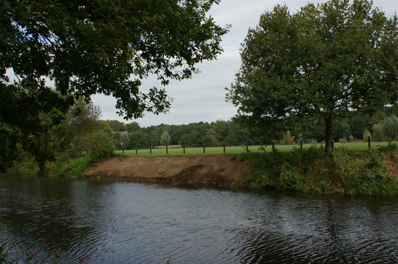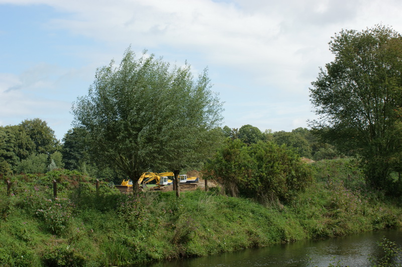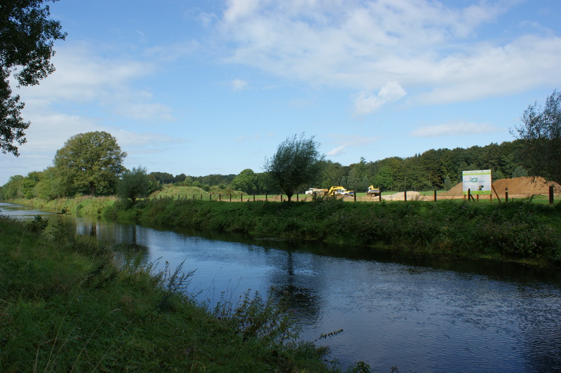 Die Emsböschung wird auf einer Strecke von ca. 580 Meter entfesselt. Das bedeutet, das der Oberboden abgeschoben, und die darunterliegende Steinpackung entfernt wird. Das Emsufer kann sich zukünftig wesentlich naturnaher entwickeln. Die Entfesselung wird von uns ausschließlich, in den von der Bezirksregierung genehmigten Bereich, am rechten bzw. nördlichen Emsufer stattfinden. Die entnommenen Steine werden in nachfolgenden Arbeiten wieder verwendet. Aus Sicherheitsgründen mussten wir dafür den“ Weg“, oder richtiger den begehbaren Grünstreifen, sperren. In Abhängigkeit von den Arbeitsschritten und der Begehbarkeit des Grünstreifens, wird die Sperrung zurück genommen, und sich nur noch auf die Baustelle und den Neuverlauf der Ems beschränken.